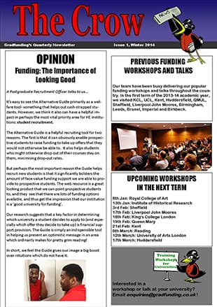 Our newsletter also features letters, stories, and opinion pieces from current and prospective students and university staff! Got an interesting funding story about a charity? Got an opinion on the state of postgraduate funding in the UK? Got news of a major new funding opportunity at your university? Get in touch with us at enquiries@gradfunding.co.uk and we will discuss its inclusion in a future newsletter!